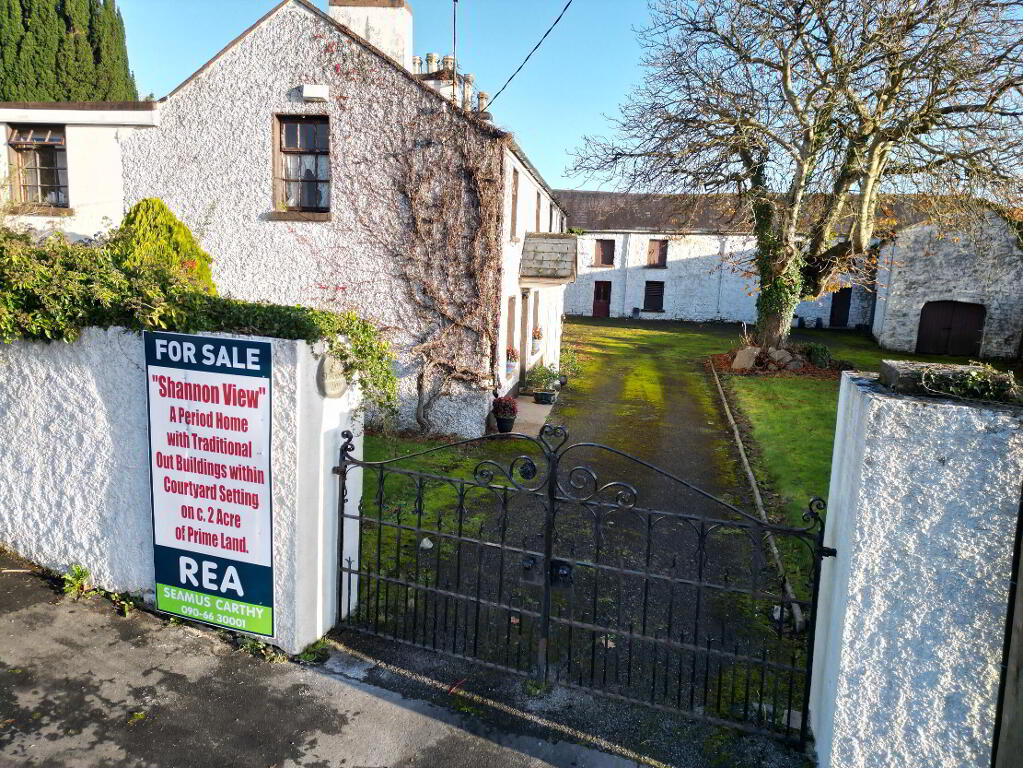 REA Seamus Carthy proudly presents a Landmark Shannon-side Residence with Historic Courtyard and Two Acres Overlooking the Marina. Shannon View is a distinguished nineteenth-century riverside residence occupying an exceptional elevated position on the banks of the River Shannon, directly overlooking the marina and Blueway in the villages of Ballyleague and Lanesborough. Built originally for the engineer of the Shannon Bridge and incorporating earlier stone outbuildings believed to form part of the De Lacy Norman castle that once guarded the river ford, the property combines rare heritage with extraordionary views and development potential. Set within about two acres of mature private grounds, Shannon View includes a traditional two-storey period home together with an extensive range of cut-stone outbuildings under natural-slate roofs arranged around a sheltered courtyard. The lands enjoy dual road frontage and three vehicular access points within the Ballyleague settlement boundary, all zoned residential. This is a once-in-a generation opportunity for discerning buyers seeking, a character family home with direct Shannon views, a boutique accomodation or tourism project in a thriving Blueway location, or a strategic riverside redevelopment site in an established village environment. Contact REA Seamus Carthy to arrange your private viewing. Viewing strictly by appointment.